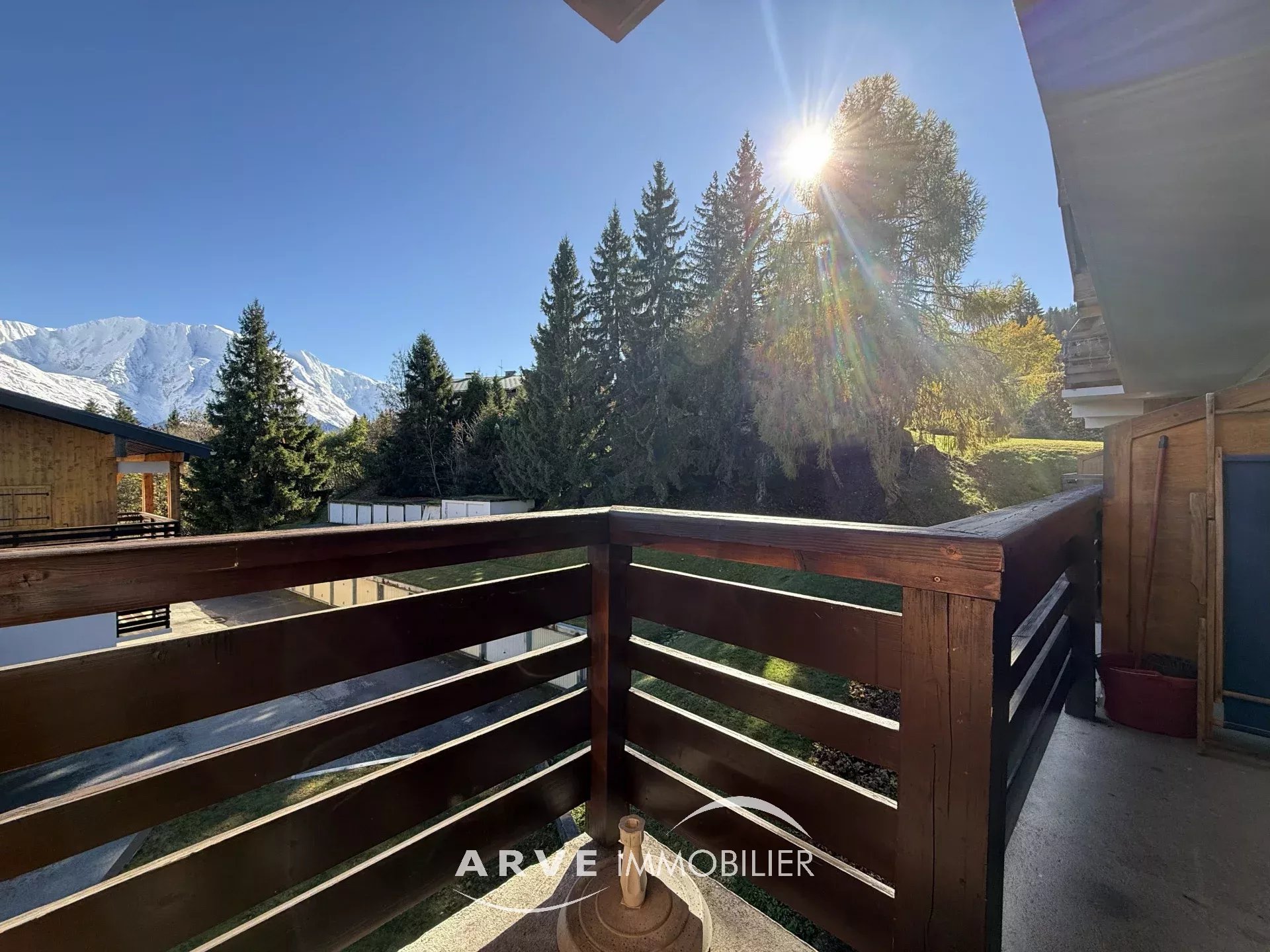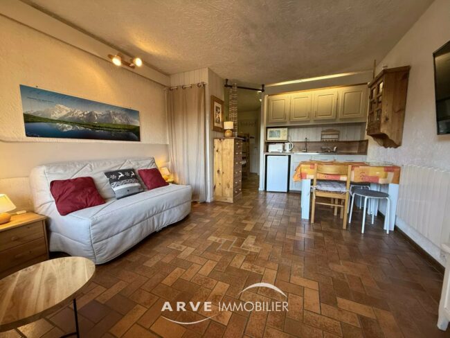 Studio coin-nuit de 22 m², très lumineux, avec un grand balcon, situé dans la résidence, avec piscine extérieure, La Christaz au Bettex, proche des pistes, tennis municipaux et départ des sentiers de montagne, magnifique vue sur le Mont-Blanc.